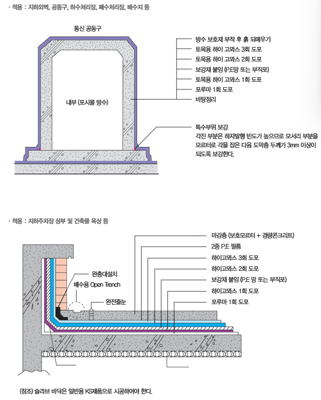 - Pipe 주변, 접합 부분, Joint, 크랙 등은 본공사 전에 하이고뫄스를 1~2회 도포하여 취약 부분을 보강한다.