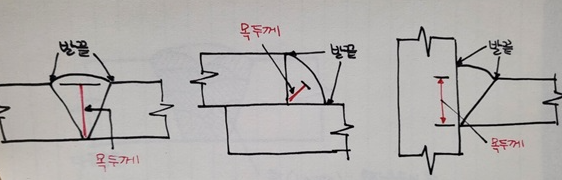 용접단면에서 바닥을 통과하는 지점부터 잰 용접의 최소두께 (보강하여 도드라져 올라온 부분은 포함되지 않음)