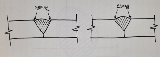 비드 (Bead)의 가장자리에서 모재가 깊이 먹어 들어간 것처럼 된 것 (주로 전류가 너무 강했거나, 용접봉의 진행이 지나치게 빨랐을 때 생긴다)