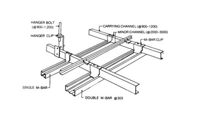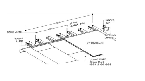 (1) M - BAR System 매립형(Concealed - Type)으로서 한국공업규격제품인 Double M - BAR, Single M - BAR, Carrying Channel, Hanger Bolt 등으로 조립하는 공법이다.