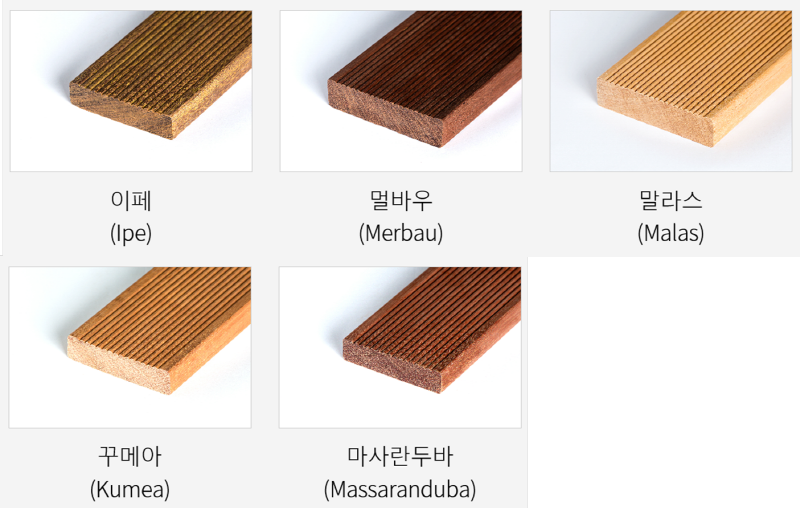 목질이 단단하고 색감에 깊이가 있어 데크용 및 익스테리어 용으로 널리 사용되는 자재