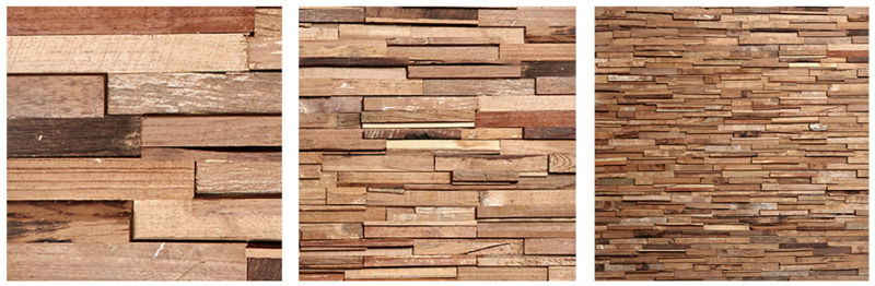 5mm 두께의 합판에 빈티지 티크 우드 조각이 랜덤으로 붙이는 방식으로 제작된 독특한 느낌의 연출이