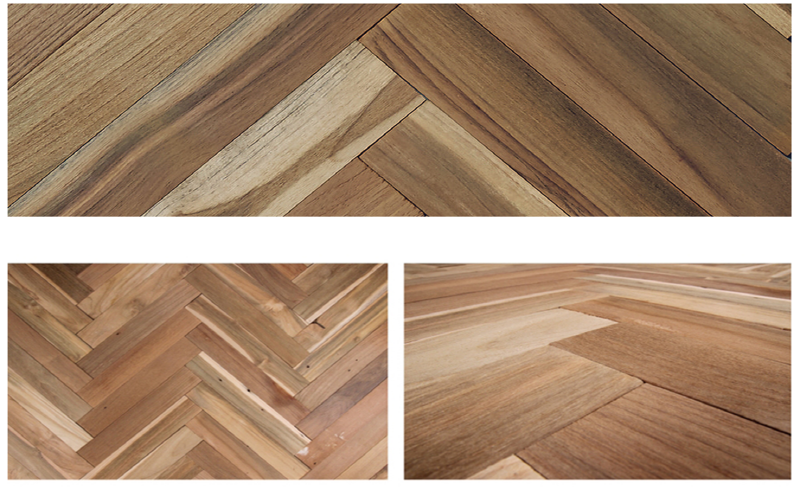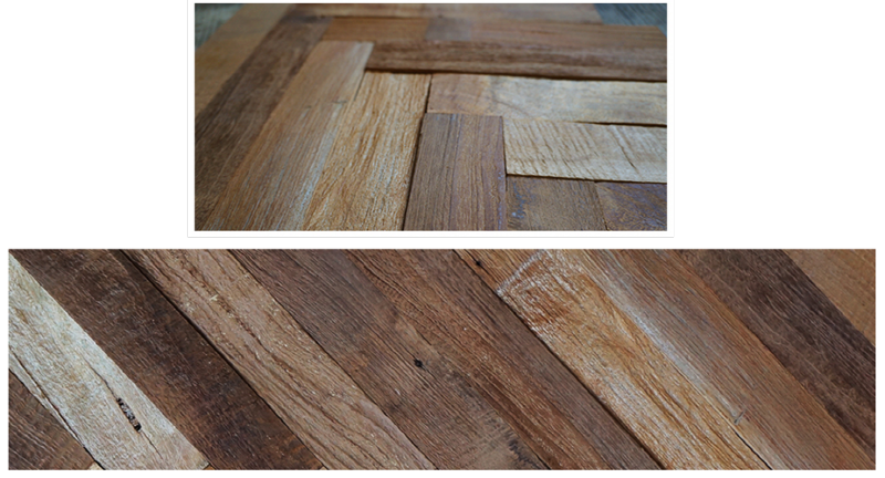 빈티지 티크 우드 러스틱이 일정한 사이즈로 재단되어 헤링본 패턴 등 다양한 디자인 연출이 편리하다.