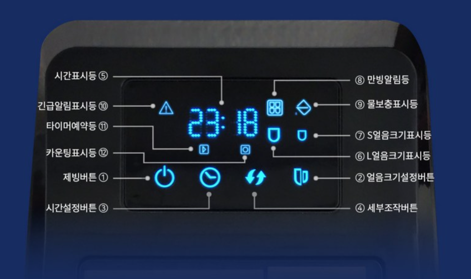 쿠쿠 포터블 제빙기제품 상세정보· FULL STAINLESS 제빙유닛· 상부급수식 물 보충· 빠른 제빙속도· 일일 최대 제빙용량 9kg· 청결한 사용을 위한 자동세척· 아이스룸 분리세척· 얼음 크기 설정