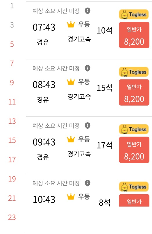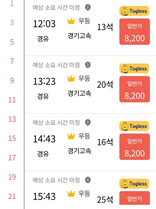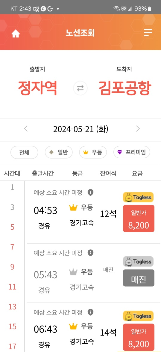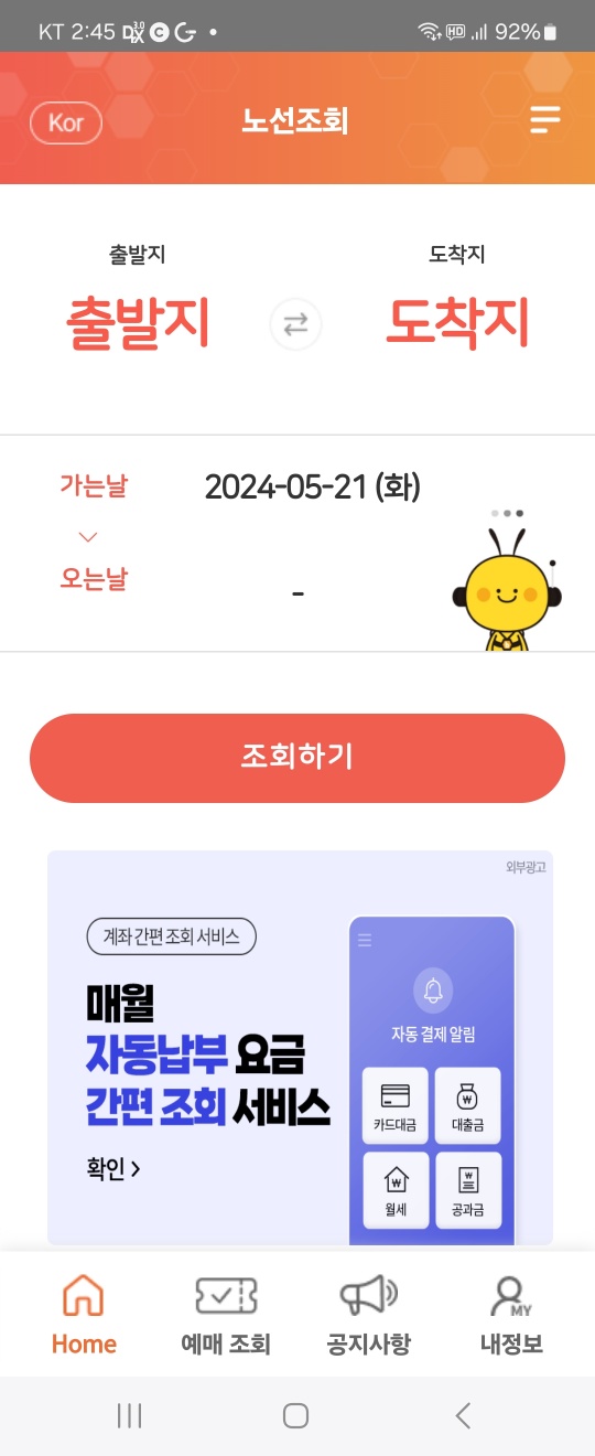 출발지와 도착지를 정확히 기입하고 날짜까지 적어서 조회를 하면