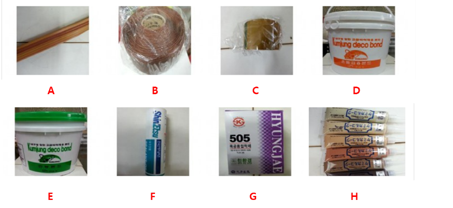 E. 타일본드(비 온돌) F. 실리콘 G. 목공 본드 H. 마루 메꿈제