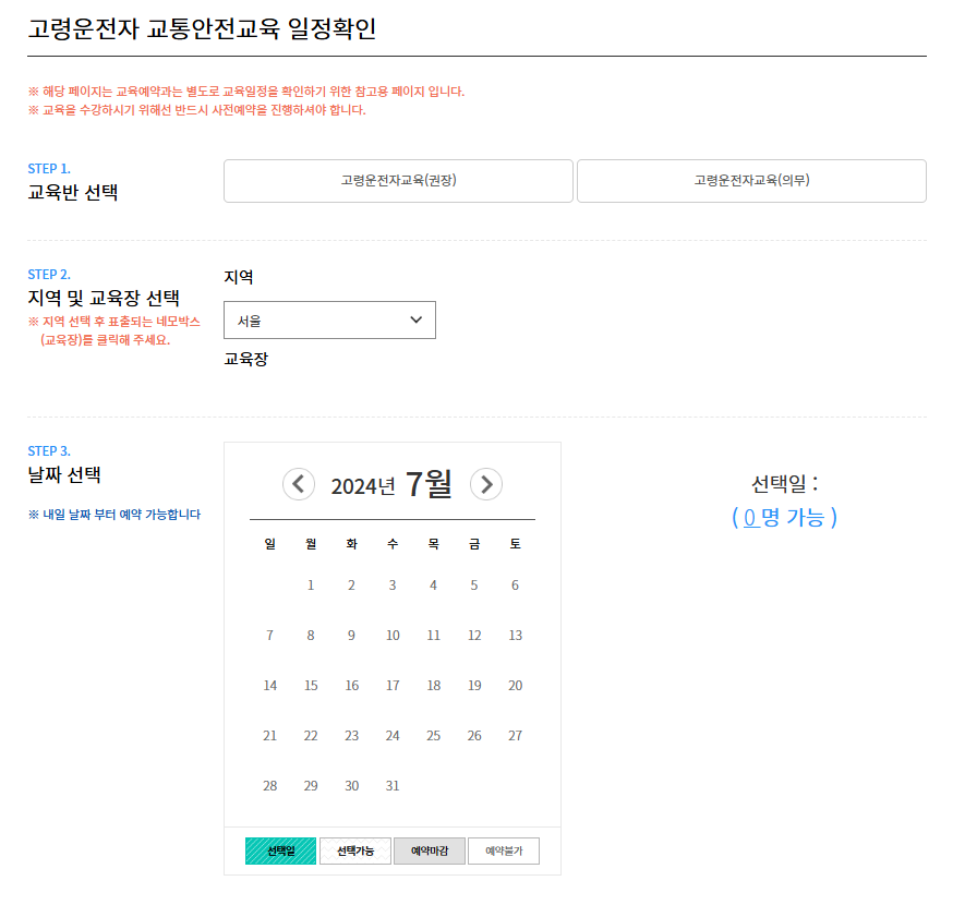 우선 교육반을 선택하고 본인의 살고 있는 지역을 선택, 그리고 날짜까지 선택을 한 후