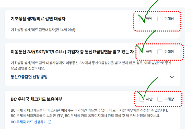 그러면 필수 신청조건이 나오는데 해당/ 미해당 여부를 체크를 한다.