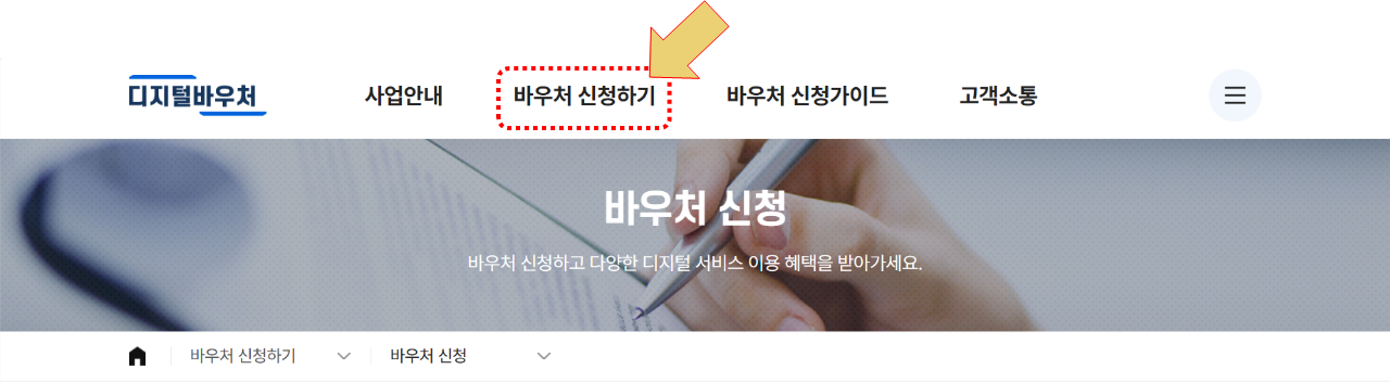 디지털 바우처 홈페이지에 들어가면 상단에서 바우처 신청하기 클릭!