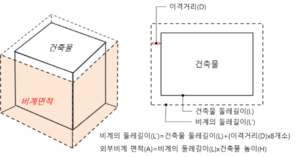벽 외벽 면에서 90cm 거리의 지면에서 건물 높이까지의 외주면적이다 |