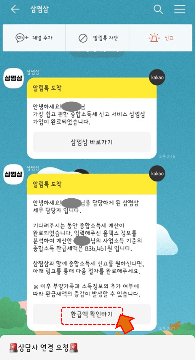 알림 톡으로 종합소득세 계산이 완료되고