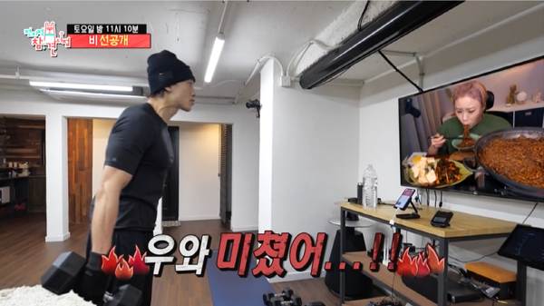 운동을 하며 먹방 유튜버 입 짧은 햇님 방송을 보는 비 ㅋ