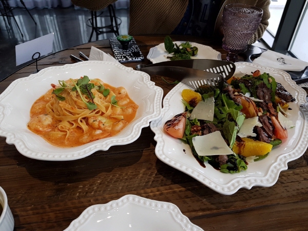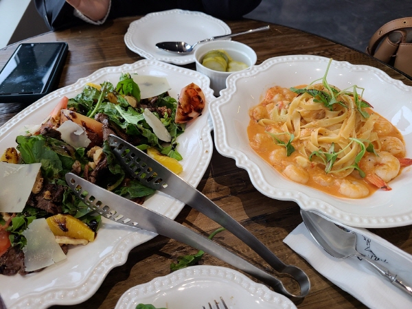 우린 감베리 로제 파스타와 그릴 비프 샐러드를 시켰다!