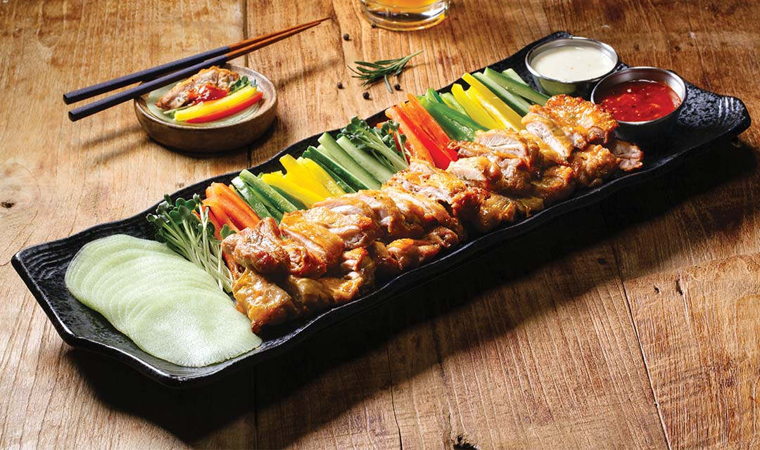 매콤한 특제소스로 구운 치킨 순살을 야채와