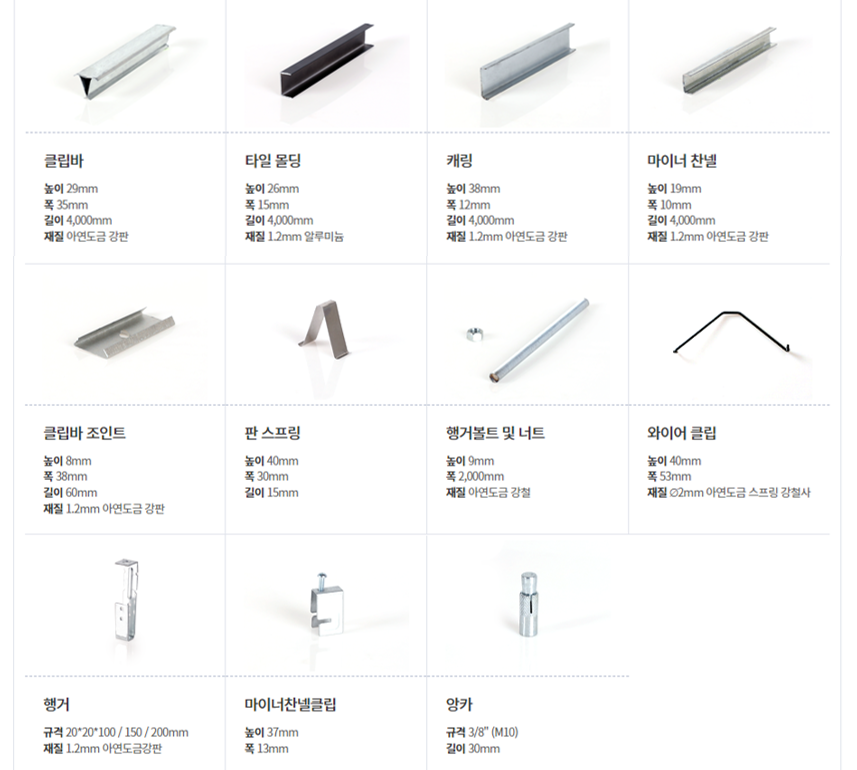 천장 시공용 경량철골 클립바 시스템의 부자재(부속품)
