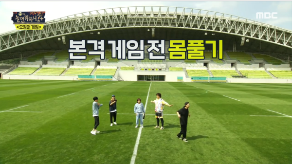 멤버들은 간단하게 공을 차며