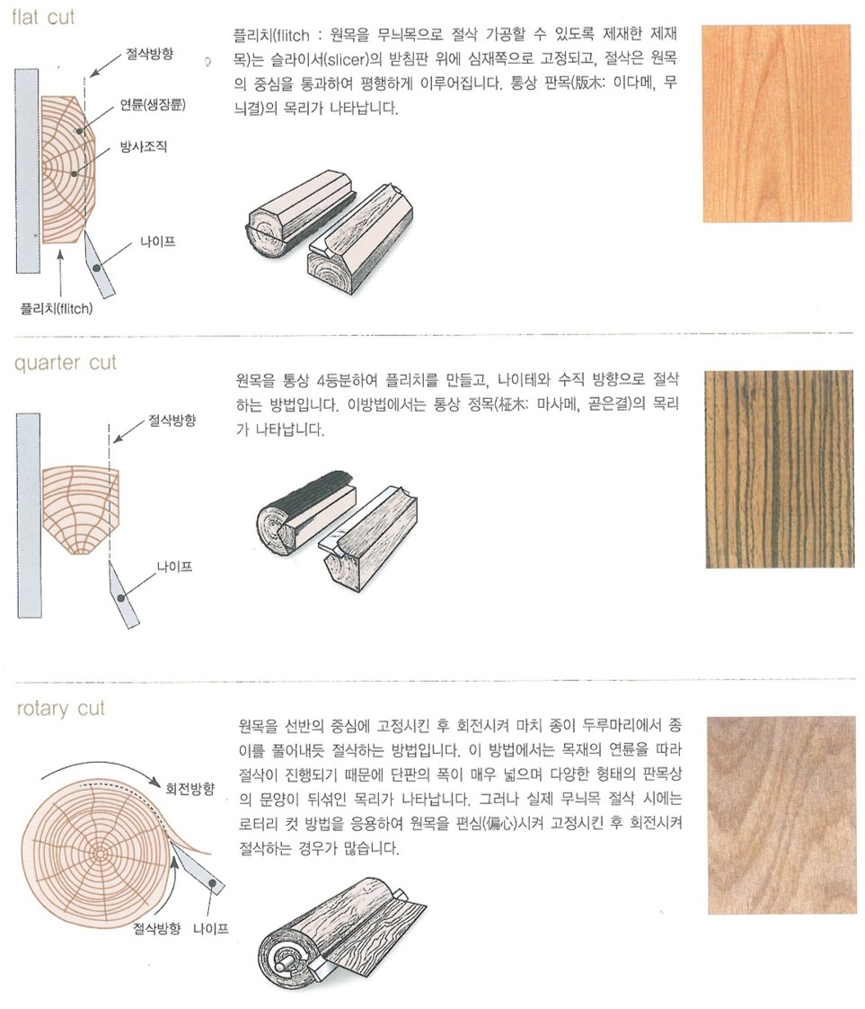 같은 수종이라도 컷팅방식에 따라 무늬결