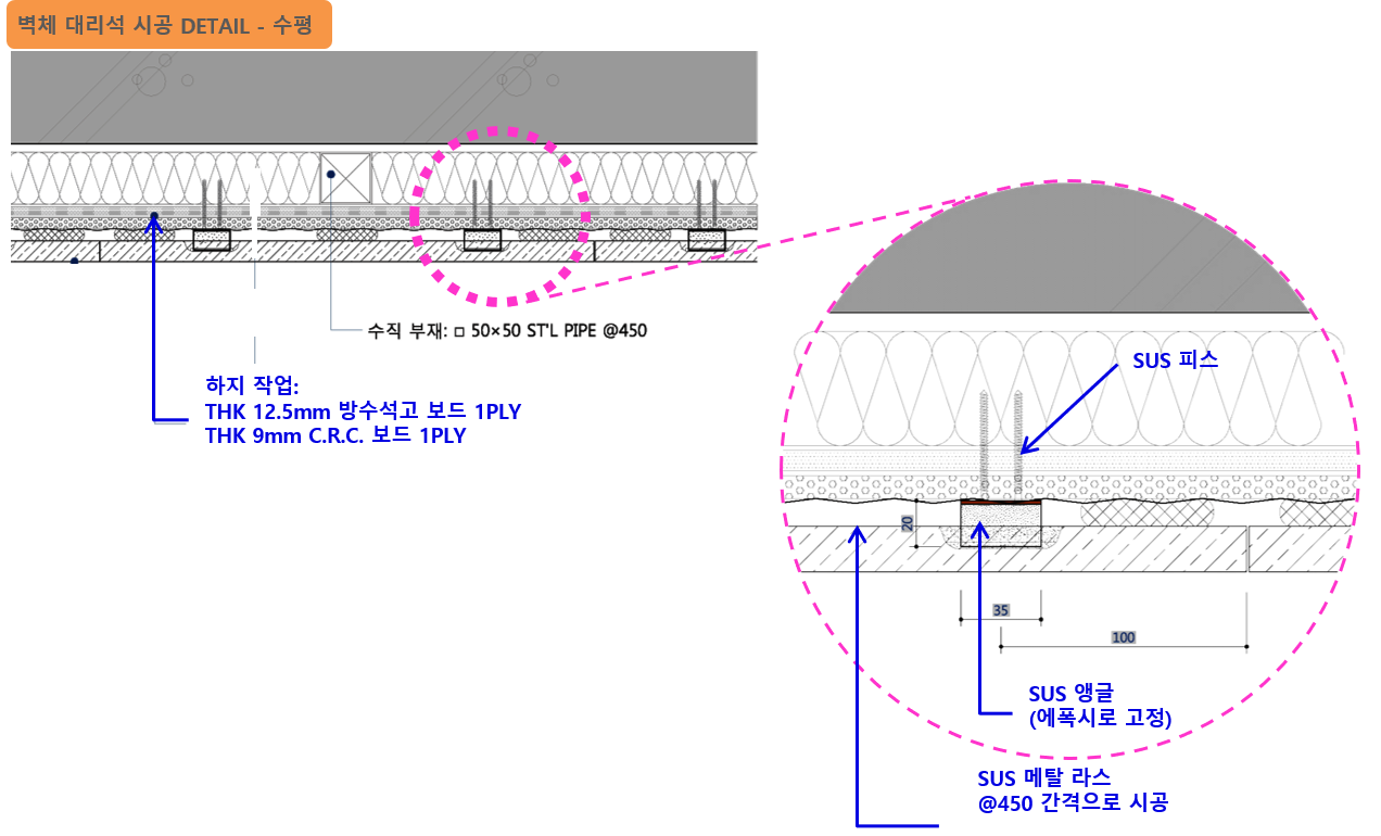 | SUS 피스 | 보드 두께 확인하여 길이 선택 | 각파이프 450간격, 골조에 걸리게 시공 |