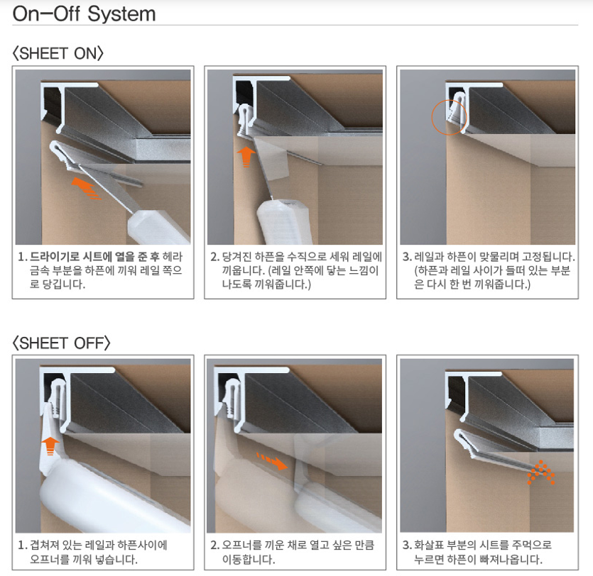 중간 부분부터 시트를 팽팽하게 당겨 레일에 고정