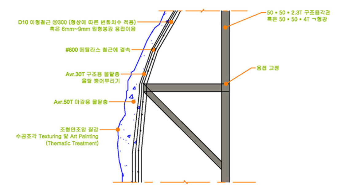 전문조각가들이 제작한 철골구조 위에 미장 바름하여