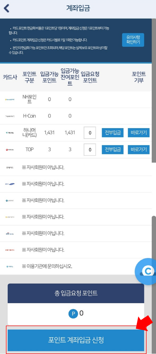 그리고 각 카드사별로 원하는 포인트만큼
