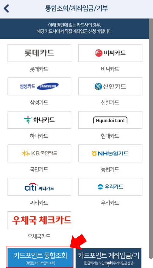 각 카드사별로 포인트를 확인할 수 있고