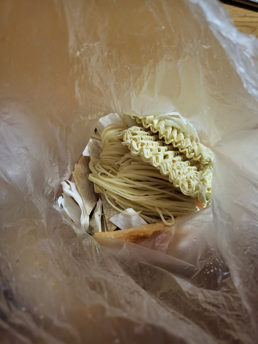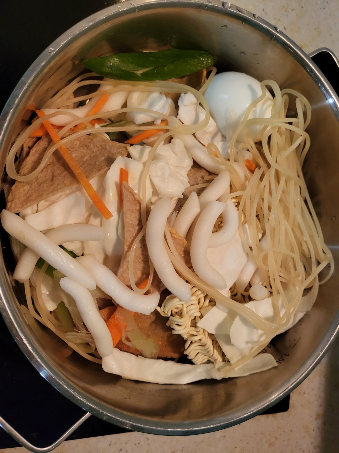 비닐 안에는 라면사리, 쫄면 사리, 어묵, 만두,