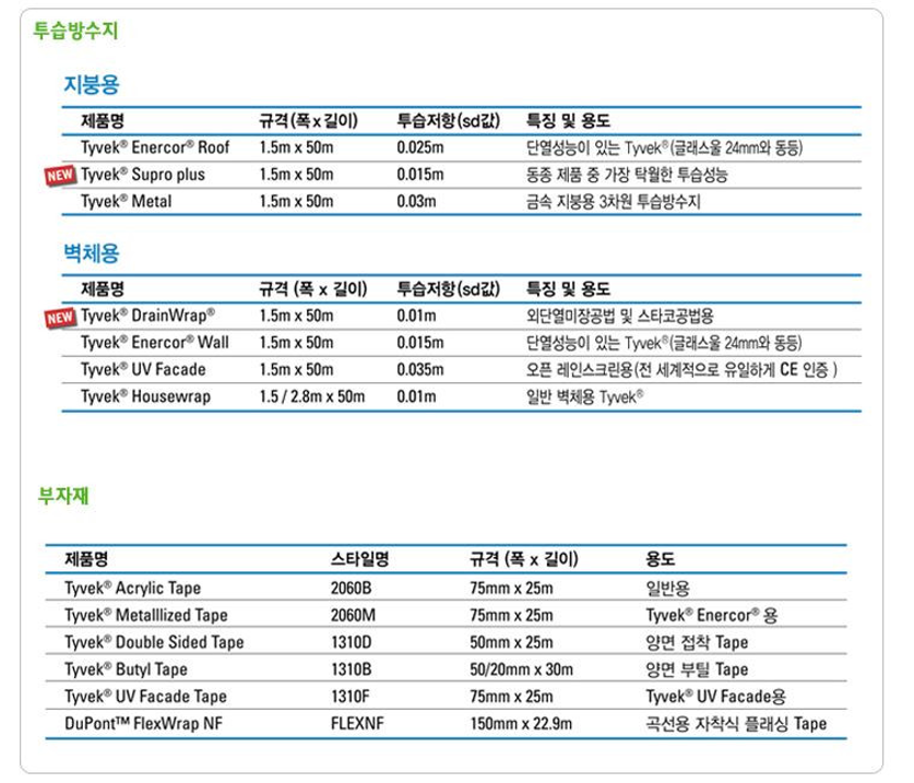 듀폰의 기밀방습지, 투습방수지 그리고 부자재 제품들을