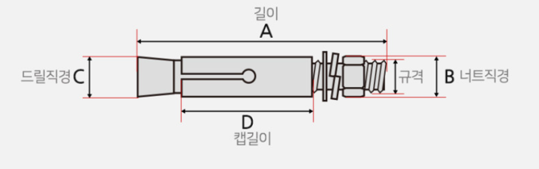 | 규 격 | 사용하중(kgf) | 천공깊이(mm) | A 길이 | B 너트직경 | C 드릴직경 | D 캡길이 |