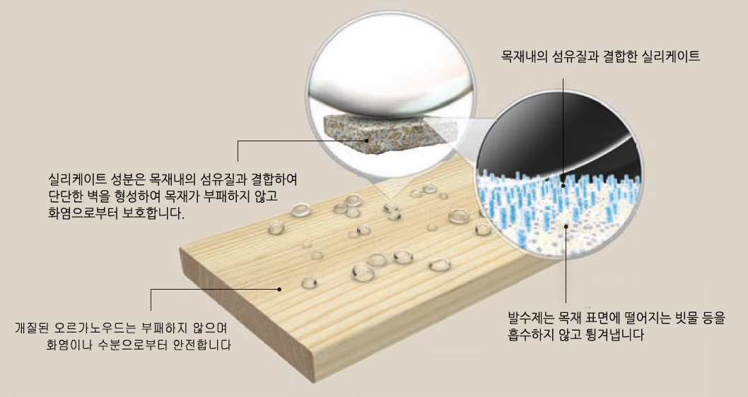 이 실리카를 물에 잘 용해되도록 만들어 목재세포에