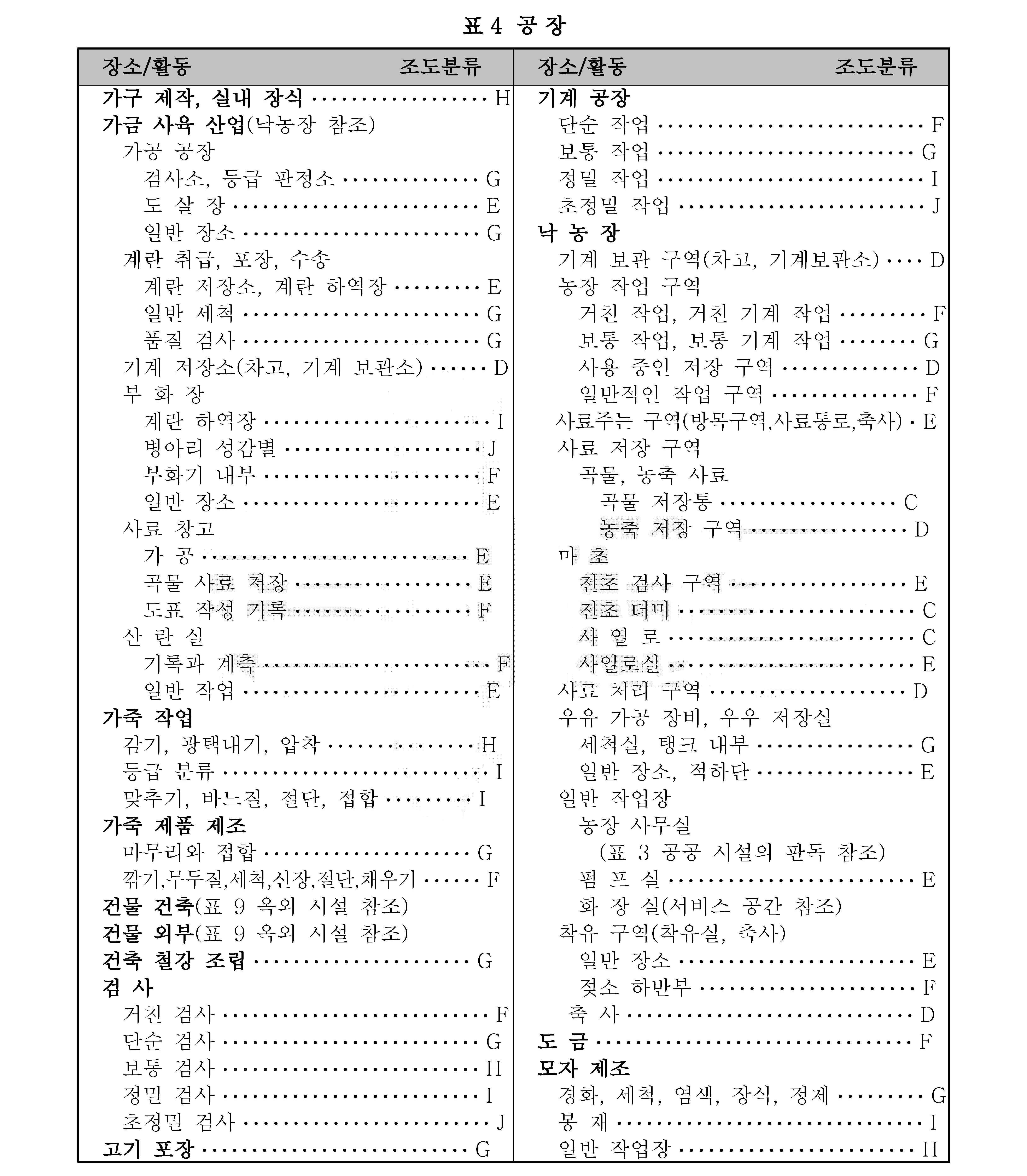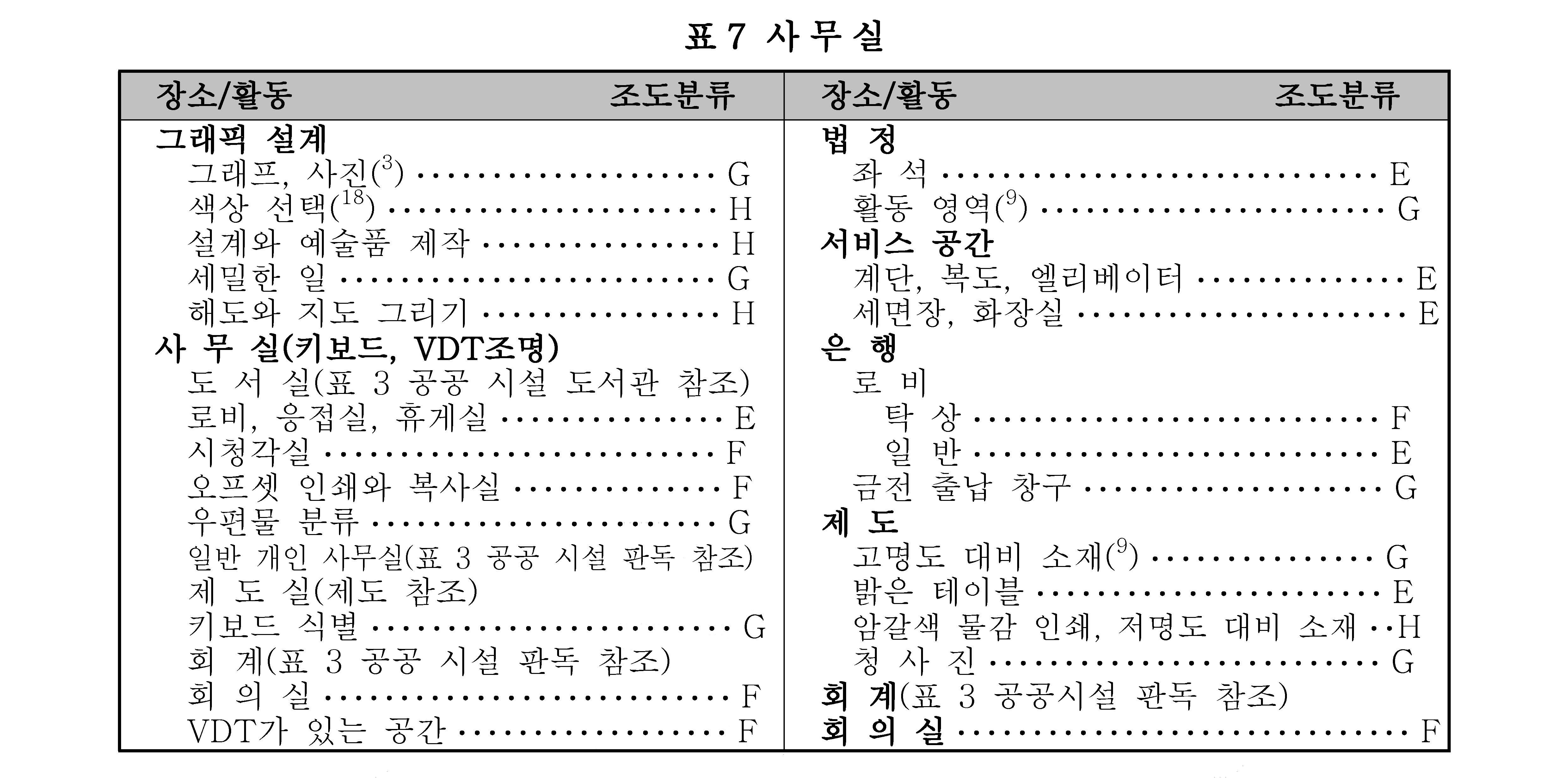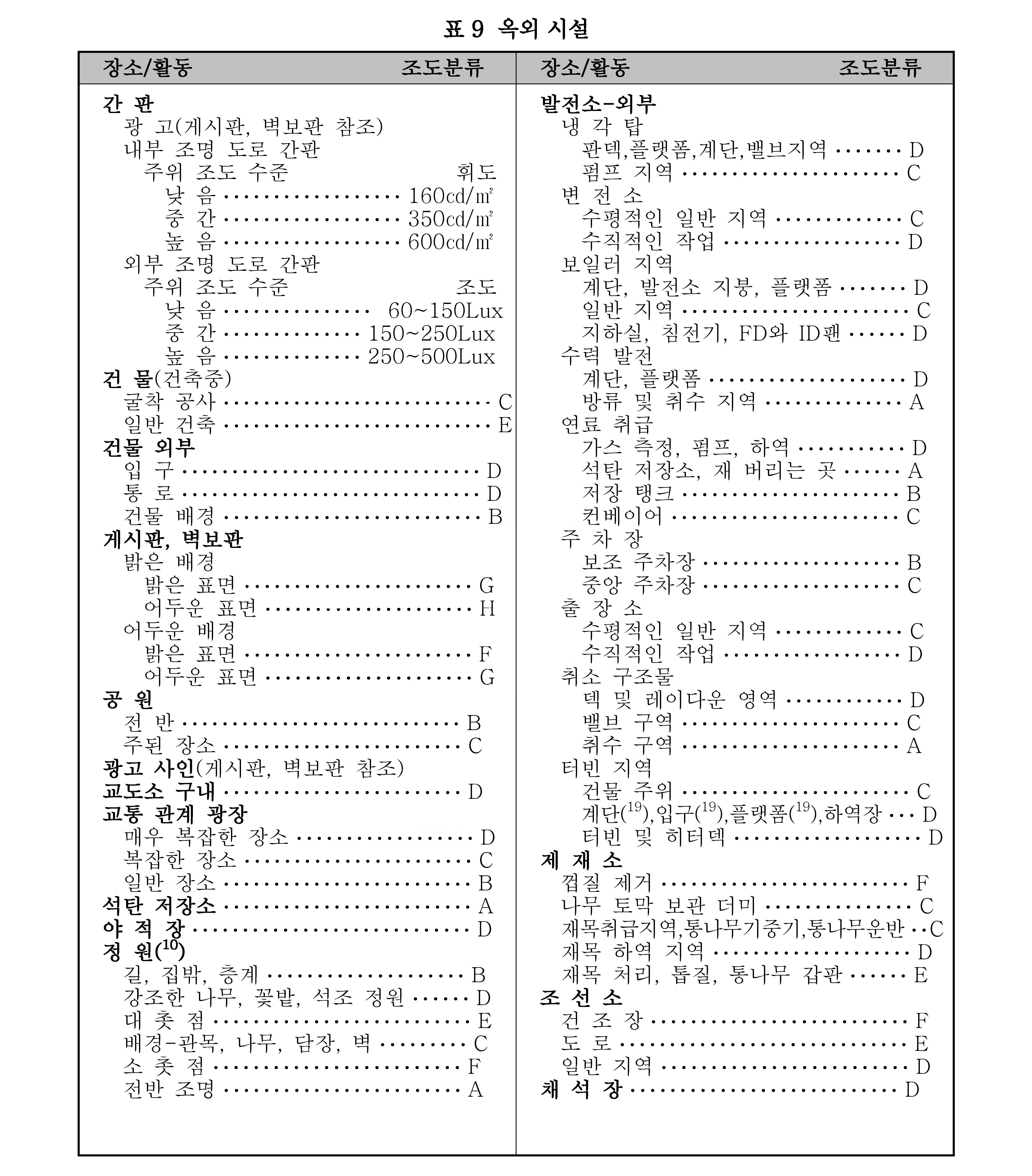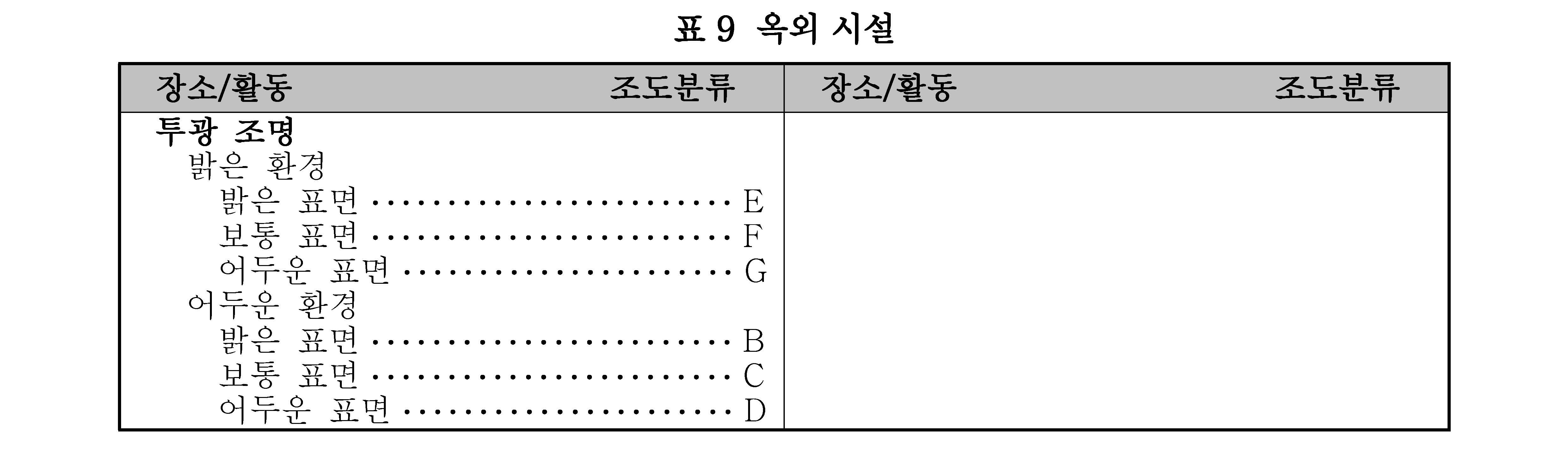 비 고 1. 조도 범위에서 왼쪽은 최저, 밑줄 친 중간은 표준, 오른쪽은 최고 조도이다.