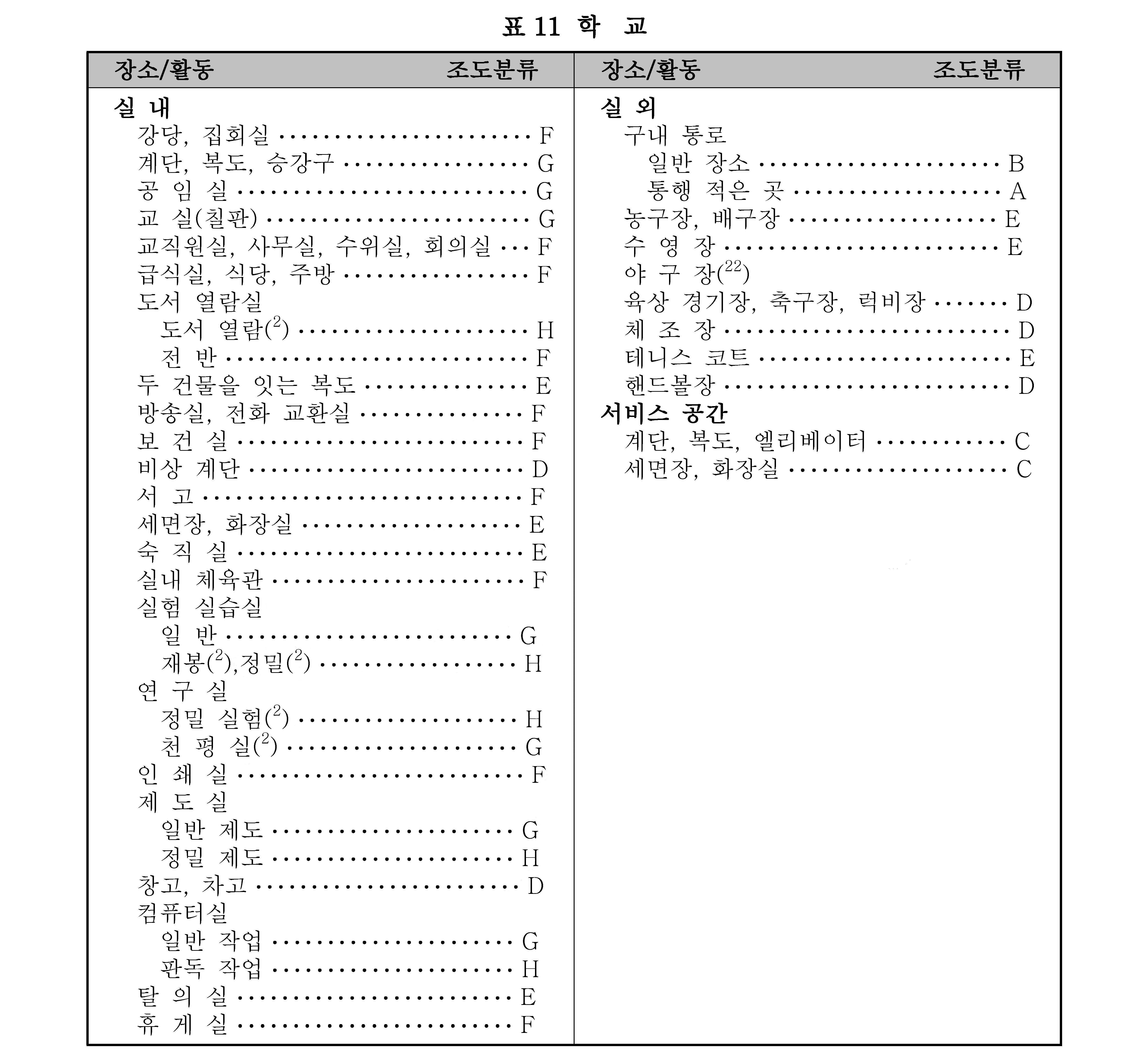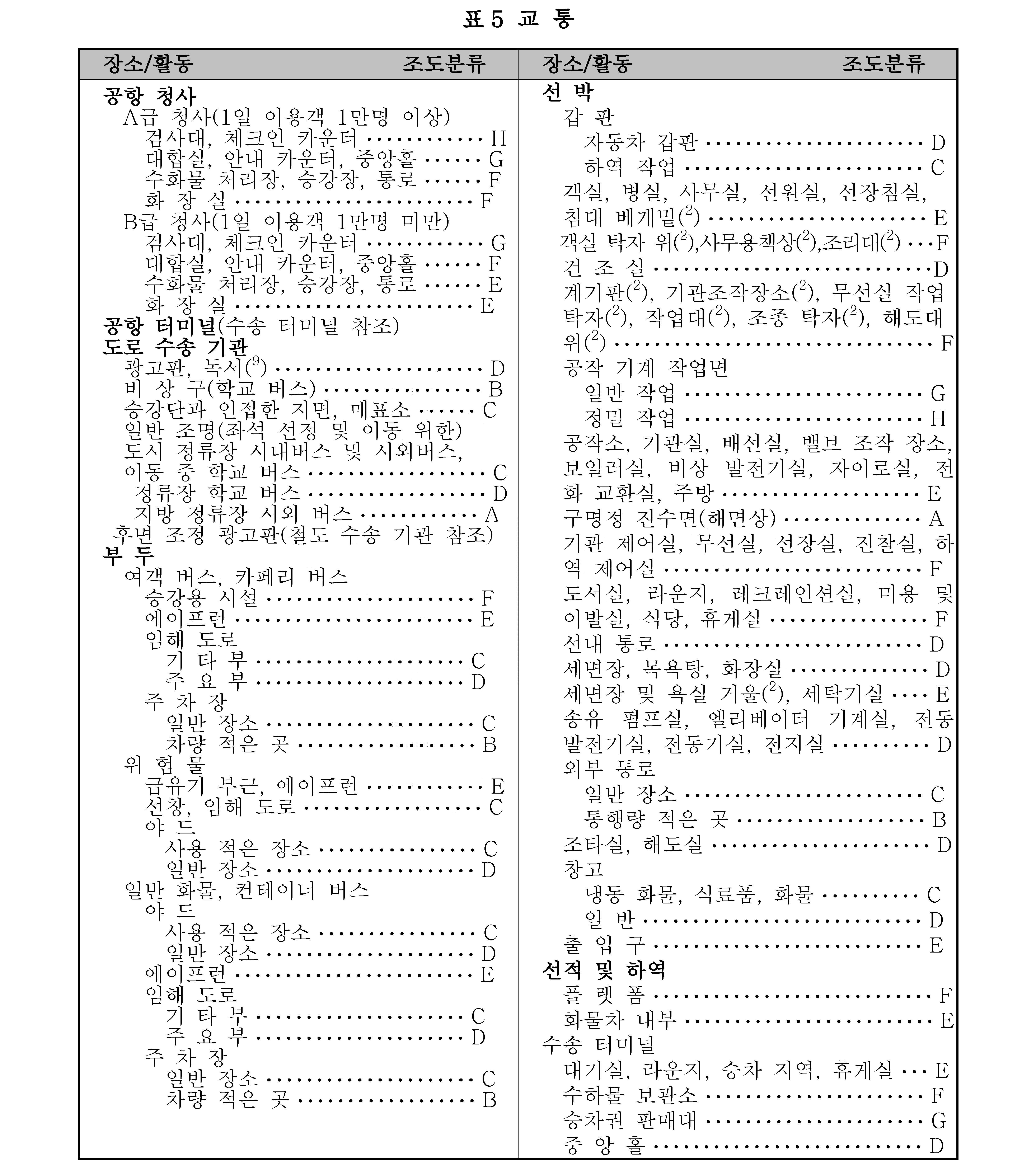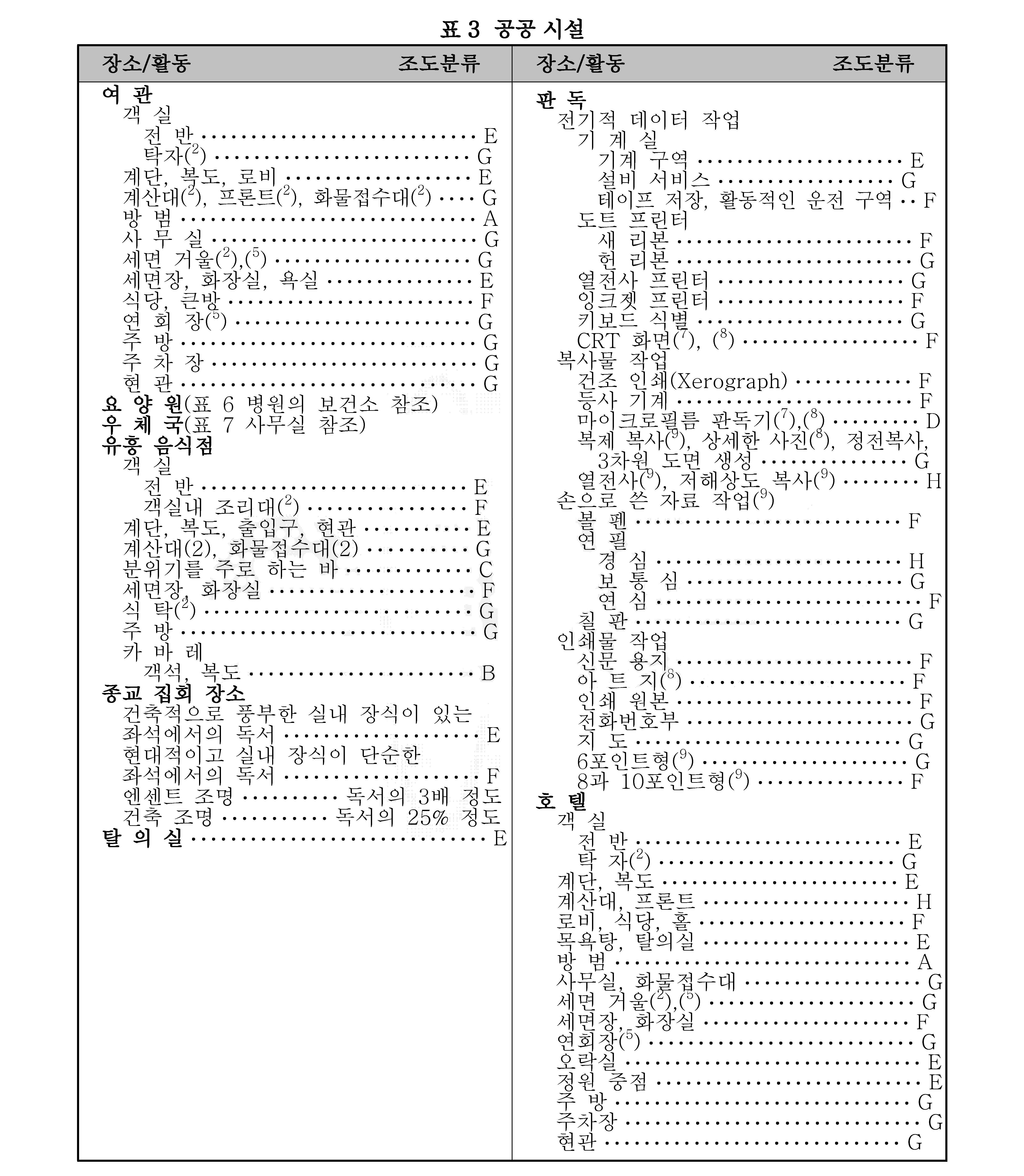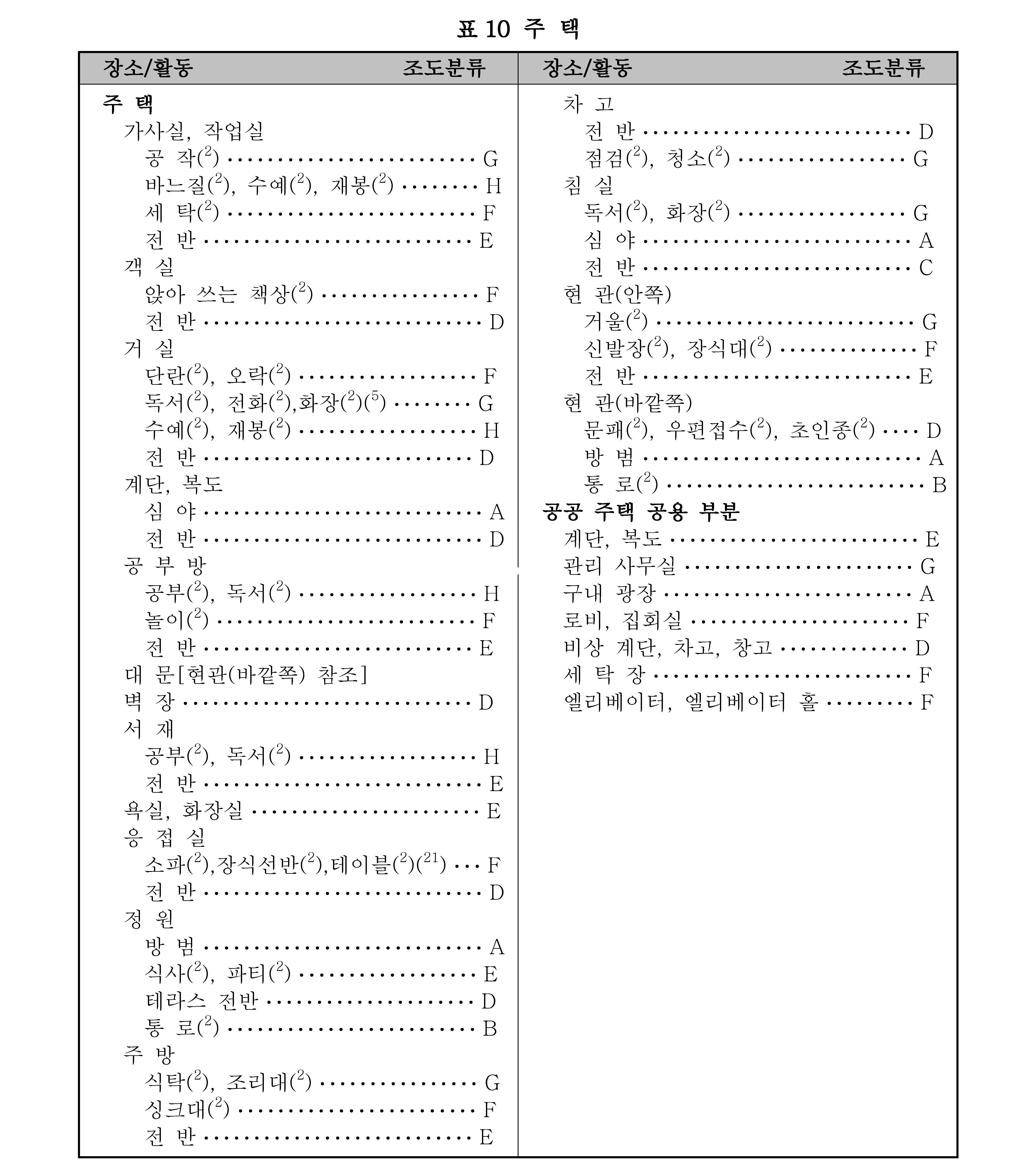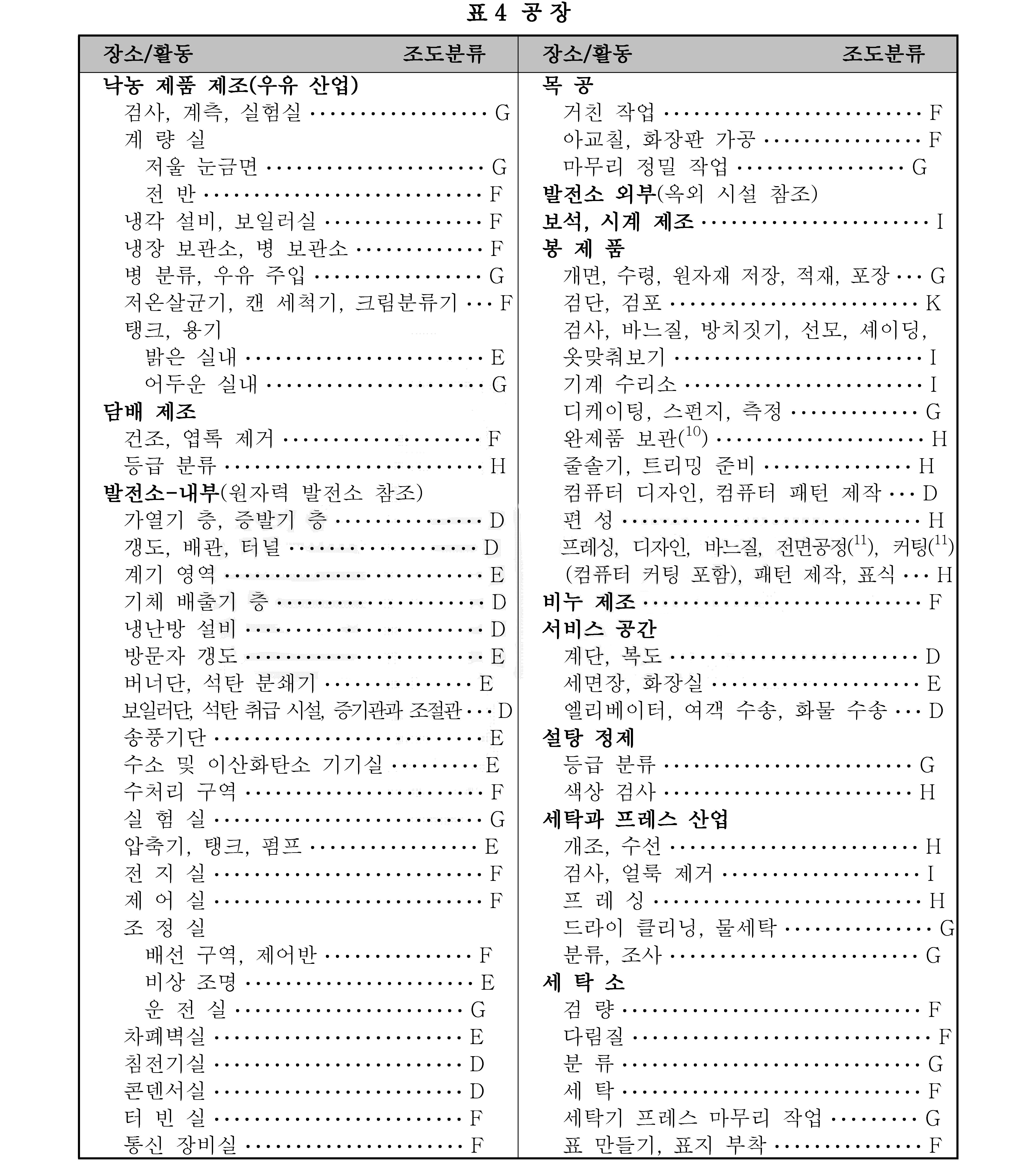 비 고 1. 조도 범위에서 왼쪽은 최저, 밑줄 친 중간은 표준, 오른쪽은 최고 조도이다.