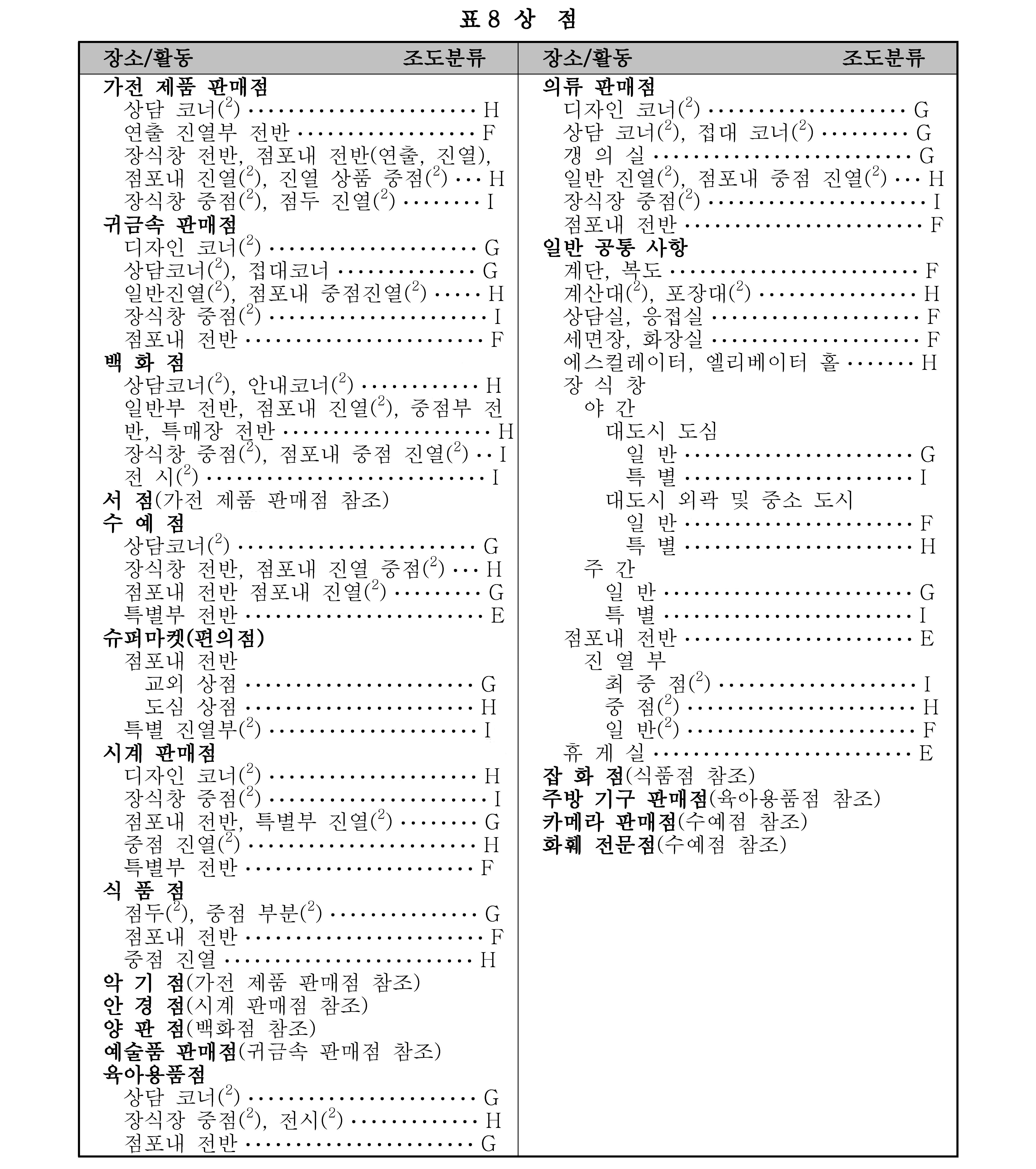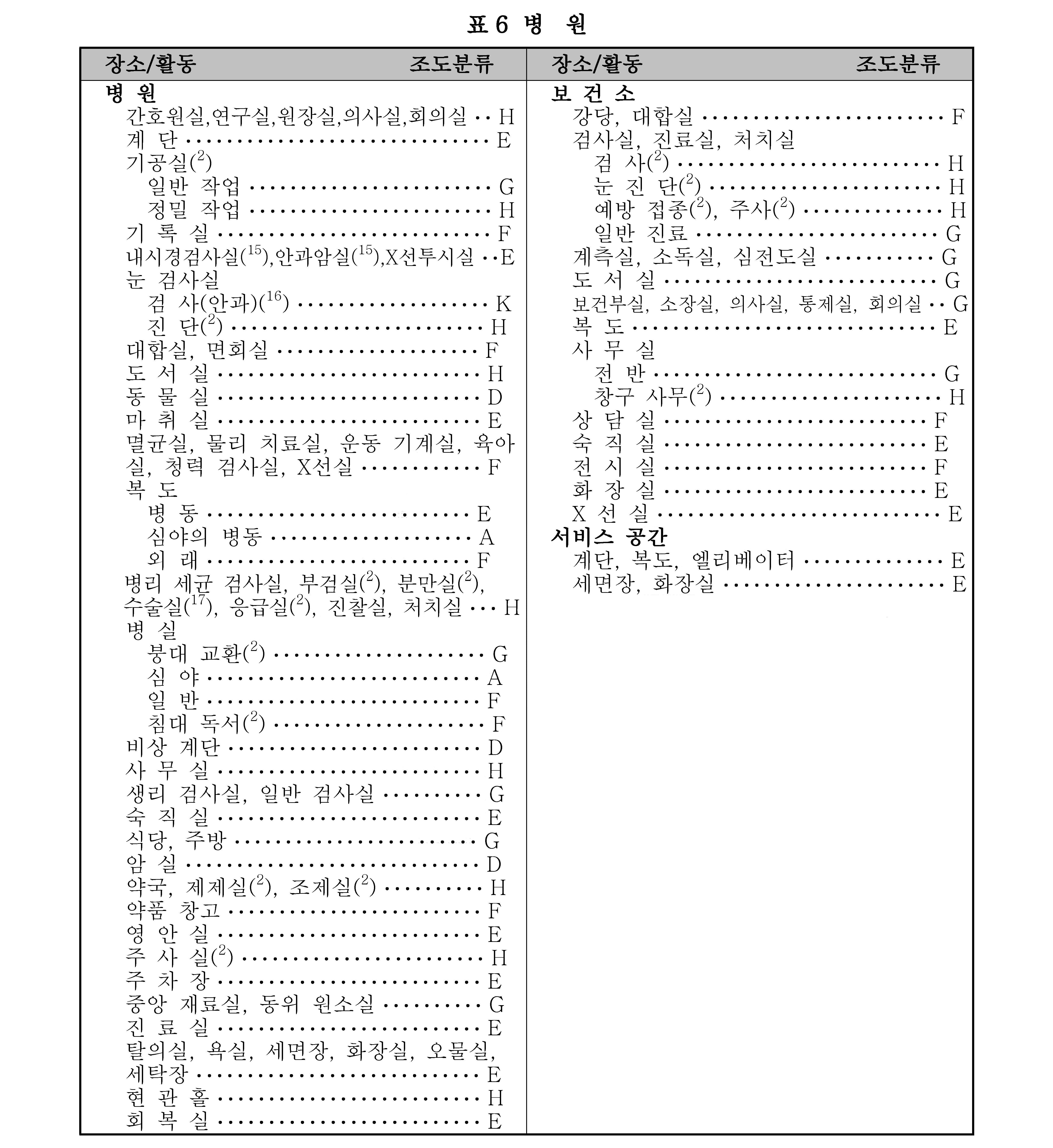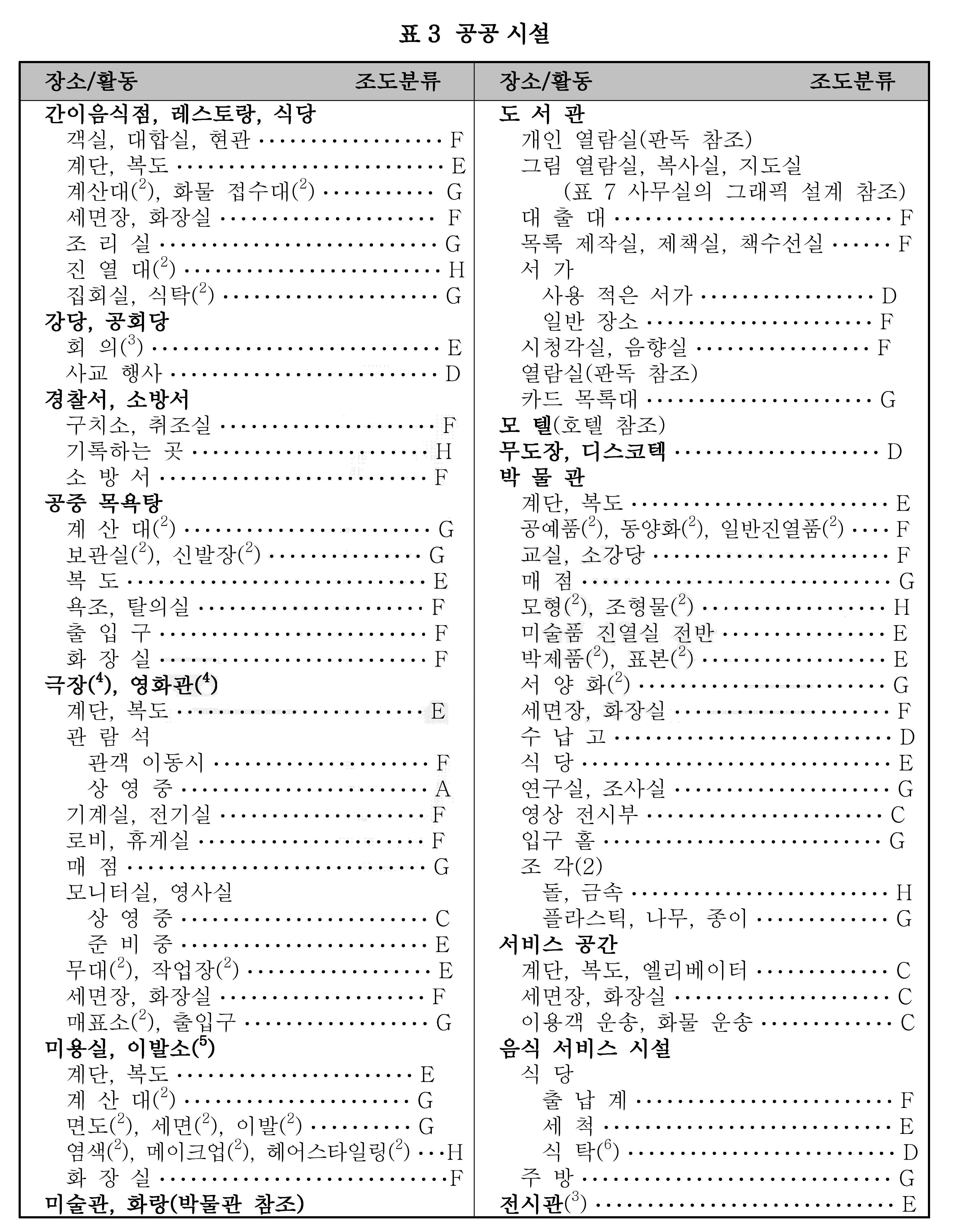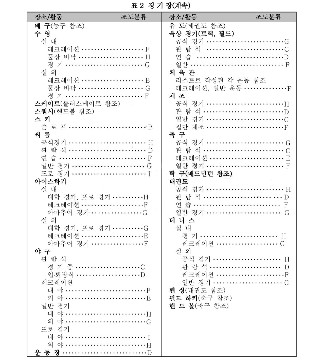 비 고 1. 조도 범위에서 왼쪽은 최저, 밑줄 친 중간은 표준, 오른쪽은 최고 조도이다.