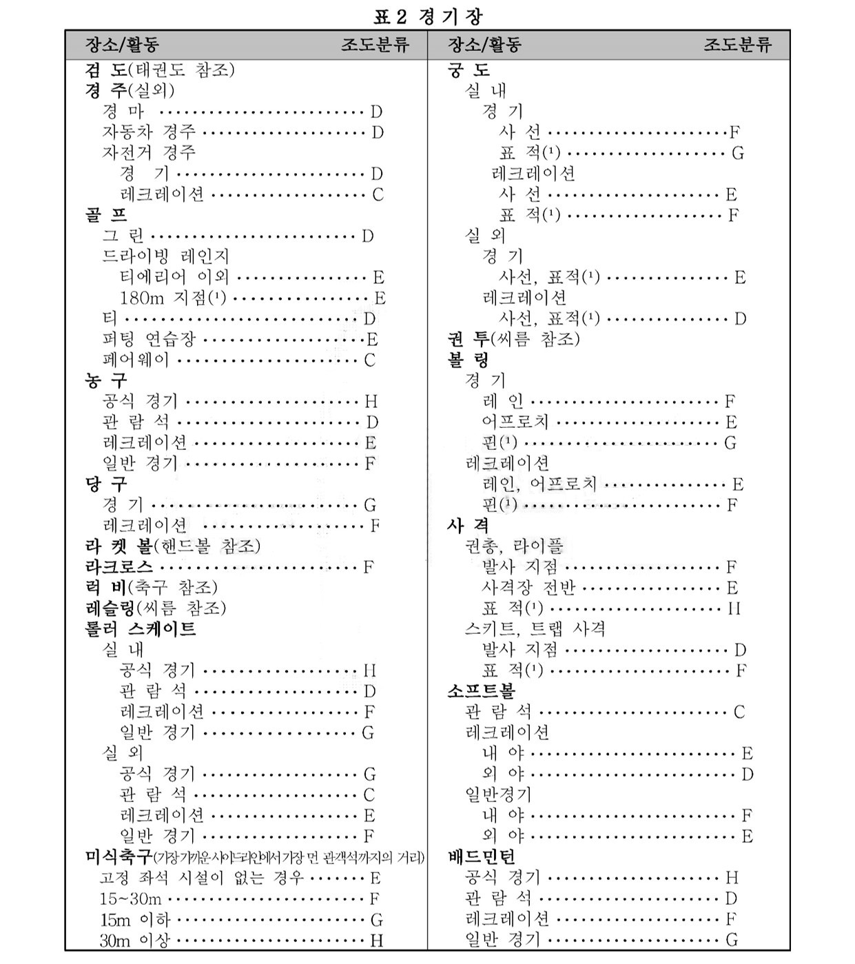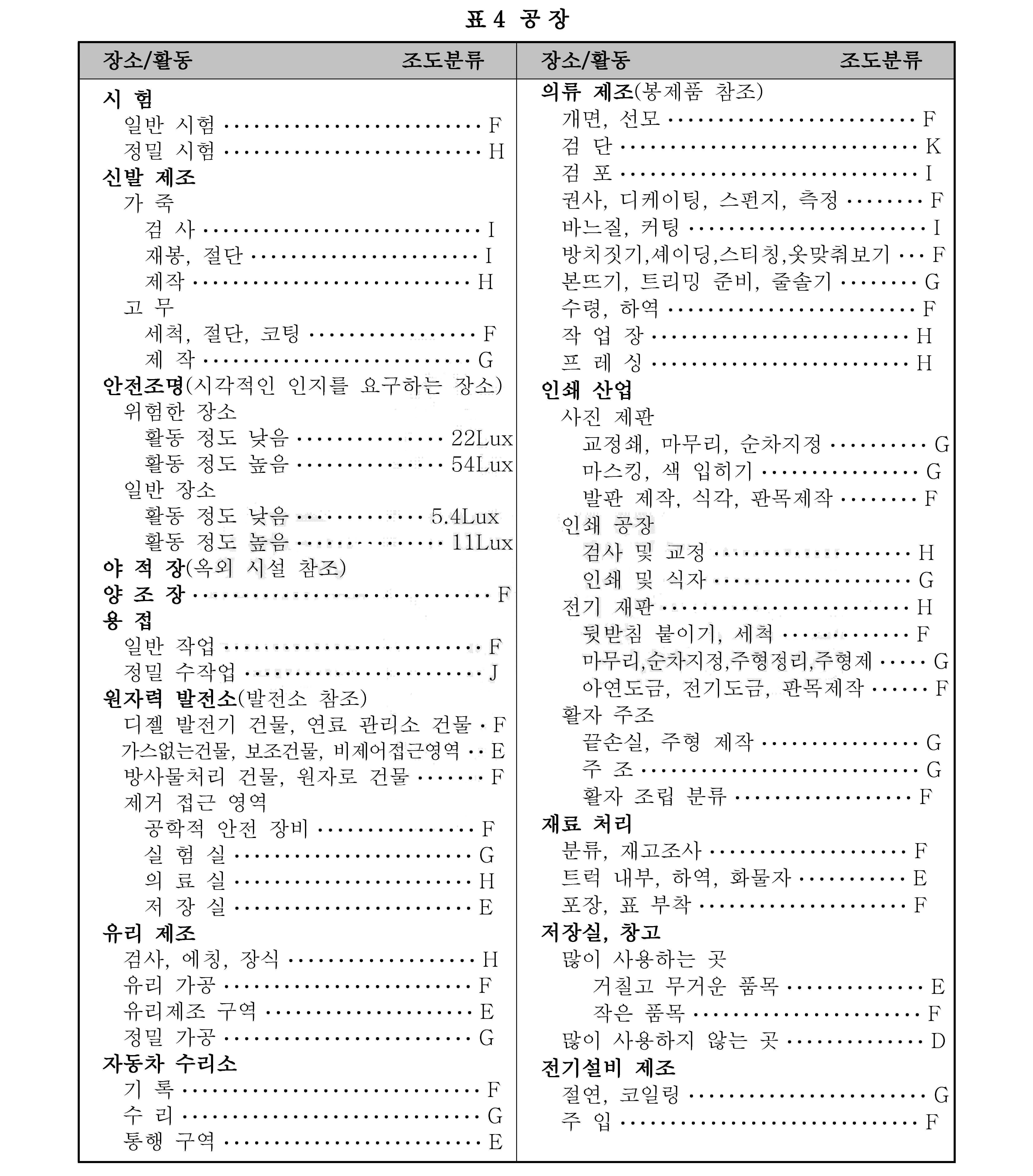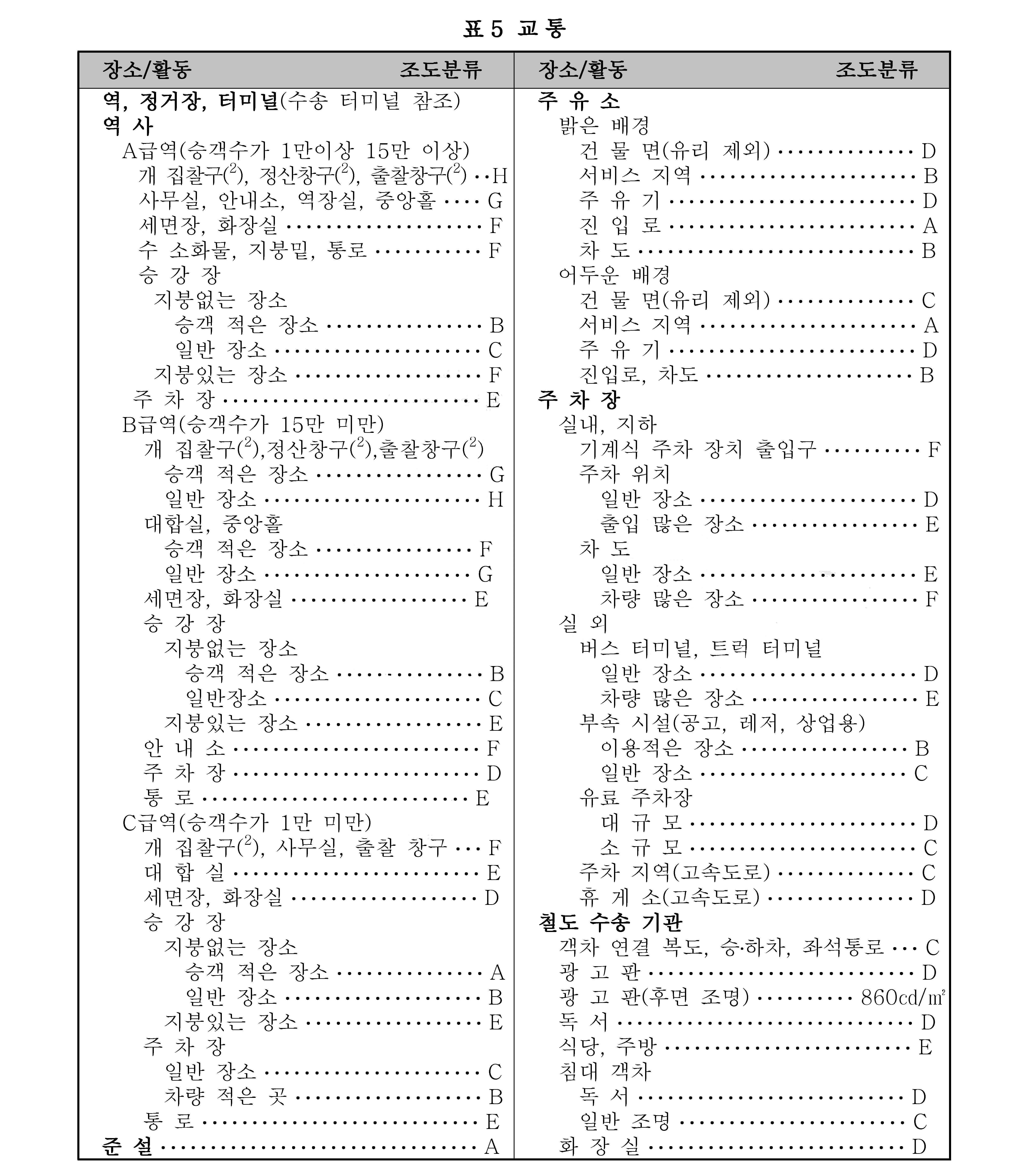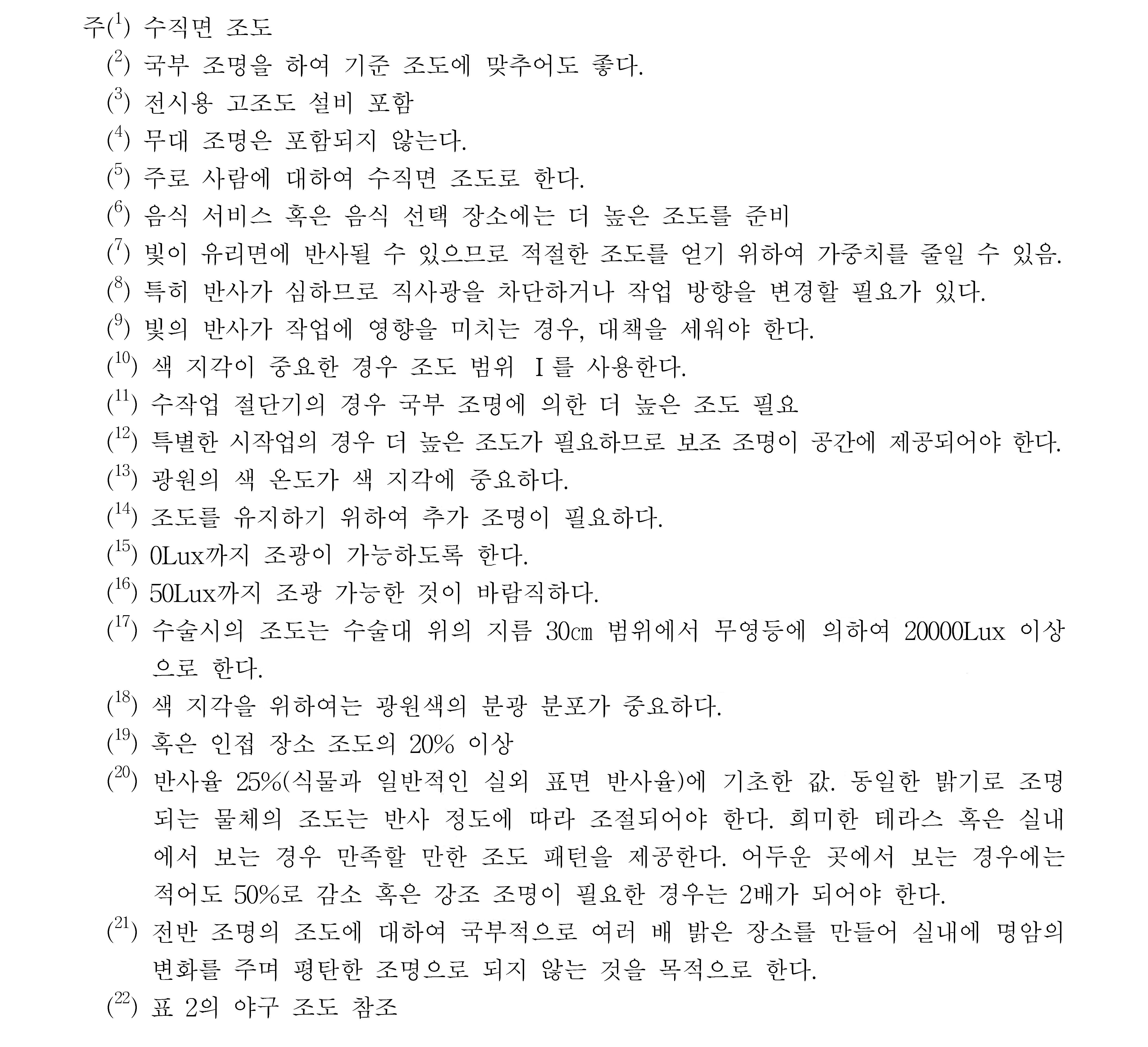 비 고 1. 조도 범위에서 왼쪽은 최저, 밑줄 친 중간은 표준, 오른쪽은 최고 조도이다.
