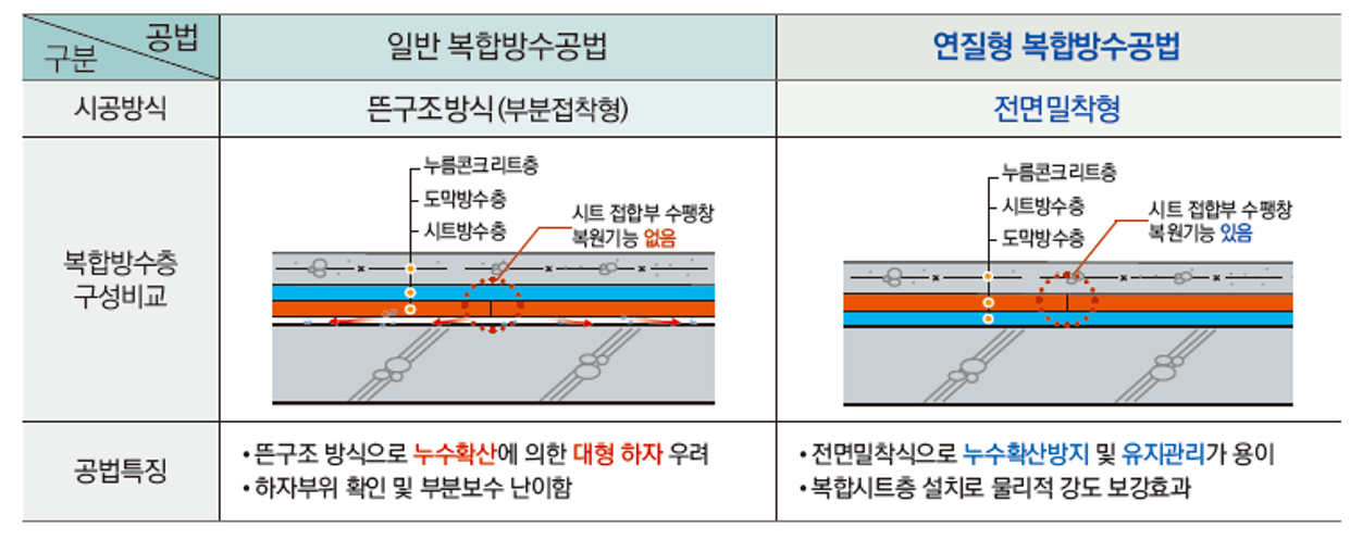 일반 복합방수와 연질형 복합방수 시공방식 비교