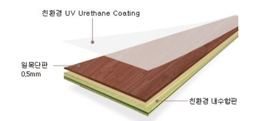 | 합판마루 | 원목의 무늬목을 접착제로 눌러 0.3~1.0mm 정도의 표면 단판을 합판 층에 접합시켜 5-7겹의 등급내수 합판을 엇갈리게 접합하여 칼금을 주어 열에 의한 변형을 막아준 후 코팅하여 표면의 강도를 높인 제품 |