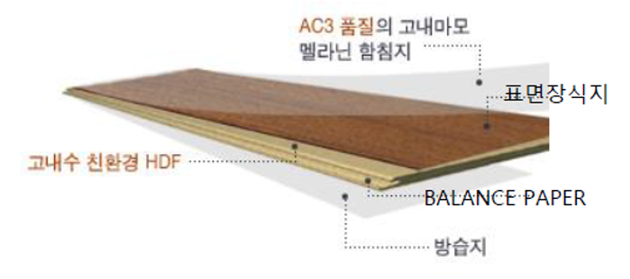 | 강화마루 | 표목질의 특성을 유지하면서 목재의 약점을 보완한 마루재로 목재 Scrap에 경화성 수지를 이용하여 압축 성형한 기재에 인쇄된 열경화성 시트와 투명 시트를 적층(HDF)후 HPL 또는 LPL로 처리로 표면이 강하고 유지관리가 편하게 가공한 제품 | - 스크래치나 충격에 의해 쉽게 긁히거나 찍히지 않으며, 낙서나 오염이 쉽게 제거됨 - 정전기가 전혀 발생되지 않아 청소가 쉽고 위생적임 - 무거운 가구, 의자바퀴 등에 의해 눌림 자국이 남지 않는다 - 뛰어난 표면 방수성과 우수한 내열성/ 차음성을 지닌다 - 단열효과가 뛰어나 여름에 시원하고 겨울에 따뜻하다. - 탄력성에 충격흡수 기능이 더해져 오래 머물러도 피로하지 않다. |
