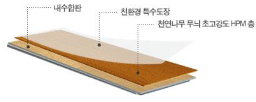 | 강마루 | 합판 위에 PVC를 입힌 자재로 강화마루의 단점을 보완한 제품으로 MDF가 습기에 약해 생기는 하자를 습기에 강한 내수합판으로 대체하여 만든 제품 | - 수축, 팽창이 비교적 작아 온돌난방 여건에 적합 - HPM 시트 사용으로 디자인이 다양하고 찍힘, 긁힘 등 충격에 상대적으로 강함 |