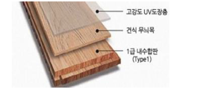 | 합판마루 | 원목의 무늬목을 접착제로 눌러 0.3~1.0mm 정도의 표면 단판을 합판 층에 접합시켜 5-7겹의 등급내수 합판을 엇갈리게 접합하여 칼금을 주어 열에 의한 변형을 막아준 후 코팅하여 표면의 강도를 높인 제품 |