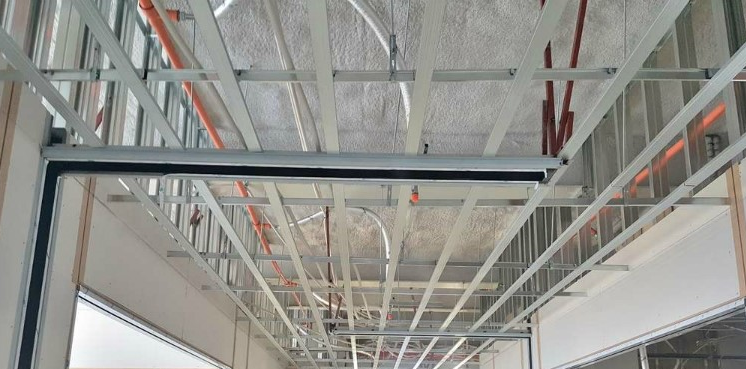 경량철골 반자틀 반자의 설치 목적 - 미관적 구성 - 분진(먼지) 방지 - 음과 열 차단 - 배선, 배관 등의 차폐 M-바(bar) 시스템(system) ▷ 사용용도 - 조절 행거: 캐링 채널과 달 볼트의 연결 - 클립: M-