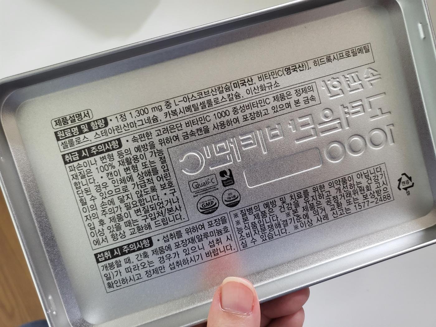 고려은단 비타민C 1000 | 원료명 및 함량 | 1정 1,080mg 중 비타민C 혼합제제 (비타민C, 히드록시프로필메틸셀룰로스), 스테아린산칼슘, 카복시메틸셀룰로스칼슘, 이산화규소 |